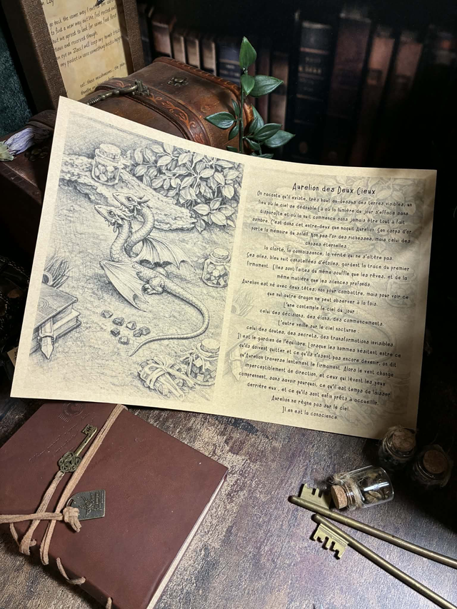 Ces feuillets évoquent des pages arrachées à un grimoire oublié, des éclats de légende à encadrer, offrir ou garder près de soi.